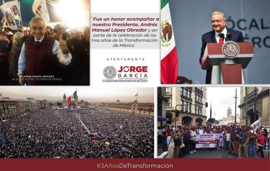 El diputado local del Distrito 26 de Morena, Jorge García Sánchez, se congratuló por estos primeros 3 años de la Cuarta Transformación, la cual, sostiene, es con el pueblo. «Hoy ya no hay privilegios, ni saqueo de los corruptos; cada día nuestro presidente Andrés Manuel López Obrador trabaja por la justicia y la igualdad de nuestro país».