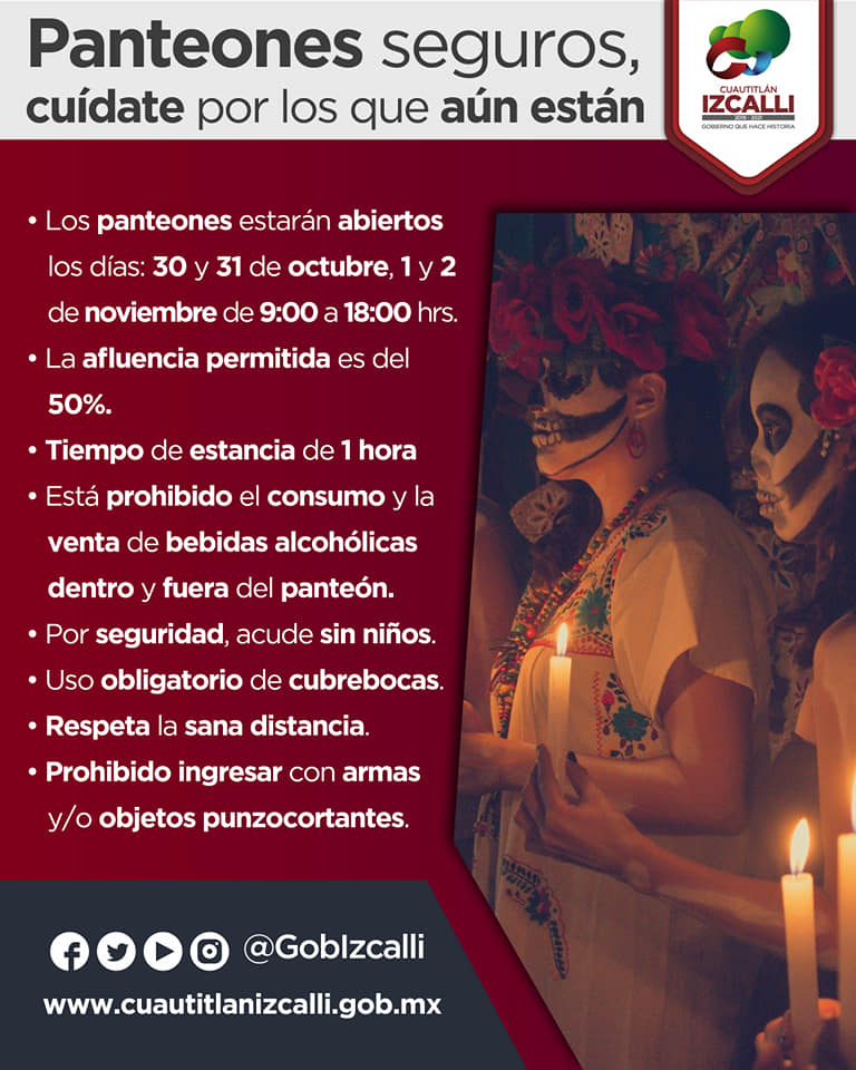 Para la asistencia a los panteones San Martín, La Joyita, Atlamica, Xhala, Huilango, San Lorenzo, El Rosario, La Quebrada, Tepojaco, Tepalcapa, San Mateo Ixtacalco, Santa Bárbara y Mausoleos del Valle, se mantendrá un aforo al 50 por ciento de su capacidad, en un horario de 9:00 a 18:00 horas y se exhorta a la población a no acudir con niños.