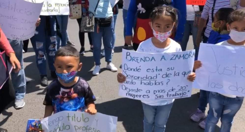Hace unas horas, el contingente marchó con pancartas y reclamos para la presidenta del DIF municipal, Brenda Aguilar Zamora, quien es la responsable general de las estancias infantiles de este organismo en el municipio.
