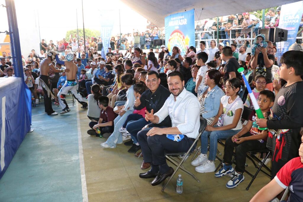 La función de lucha libre fue el plato fuerte de una jornada dedicada a la infancia, donde los asis- tentes disfrutaron de tres combates que mantuvieron el ánimo encendido a pesar de la presencia de lluvia.