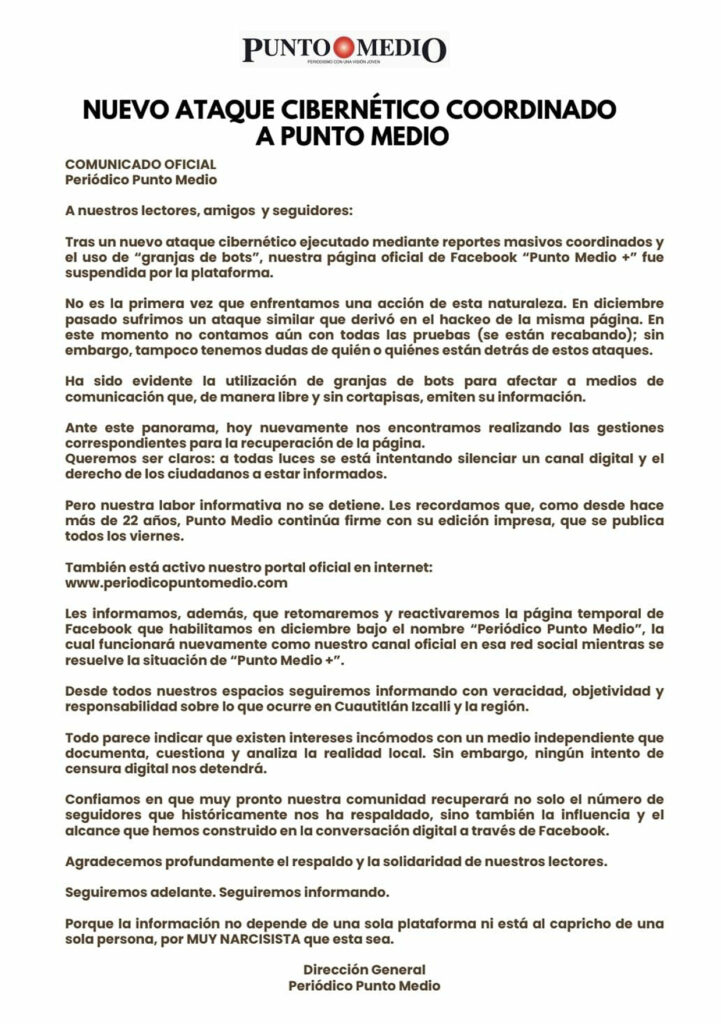 Tras un nuevo ataque cibernético ejecutado mediante reportes masivos coordinados y el uso de “granjas de bots”, nuestra página oficial de Facebook “Punto Medio +” fue suspendida por la plataforma.