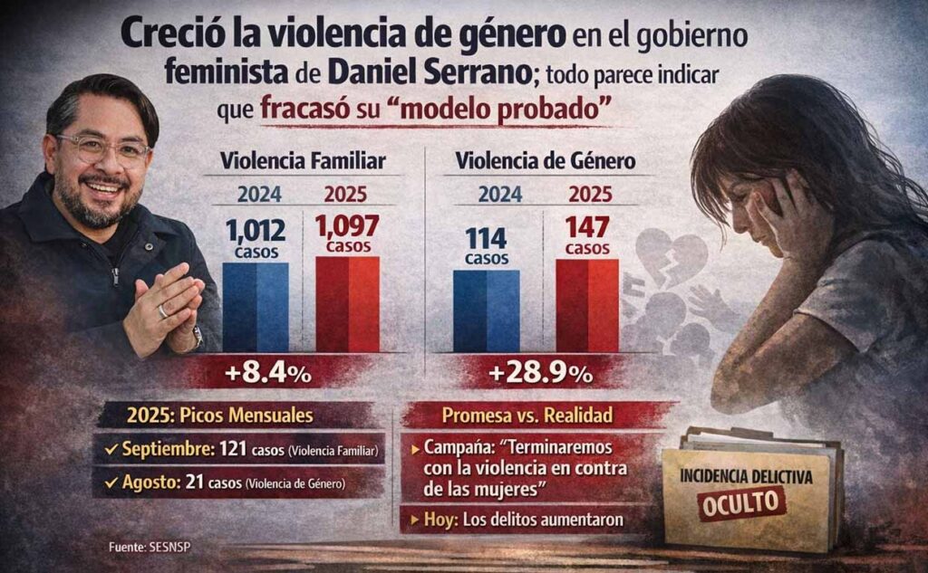 El aumento de estos delitos se inserta en un panorama general en el que, pese a la baja en algunos rubros patrimoniales, la incidencia delictiva total del municipio creció: pasó de 14,791 casos en 2024 a 15,417 en 2025, un alza del 4.2%. Es decir, la reducción no fue generalizada, como se empeña en difundir el gobierno municipal y el propio alcalde.