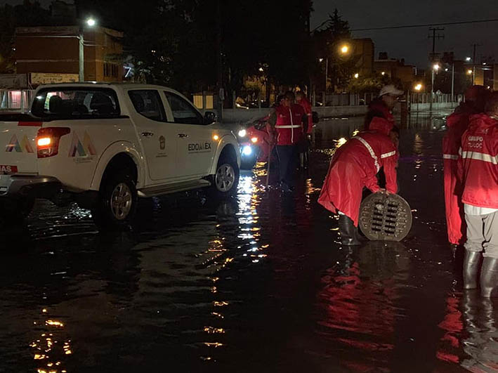 La CAEM informó que se llevó a cabo la operación de la infraestructura hidráulica para controlar el escurrimiento, con cinco camiones especializados de bombeo, un tracto camión, una retro excavadora, una bomba Thomson de 8 pulgadas, cuatro camiones de volteo y dos hidroneumáticos.
