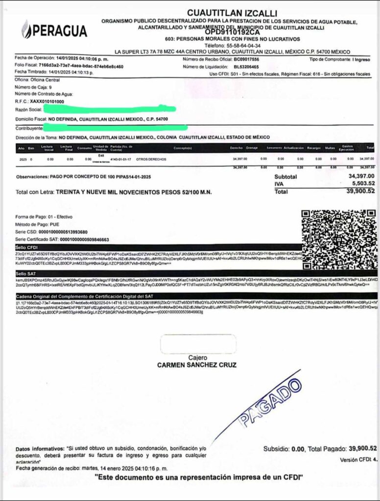 En un comunicado, los piperos negaron tajantemente que el pozo haya sido explotado de forma ilegal o “secuestrado”, como sugirieron versiones, y presentaron una factura sellada y con validez fiscal correspondientes al año 2025, que acreditan pagos realizados a la actual administración por el servicio de suministro mediante pipas.