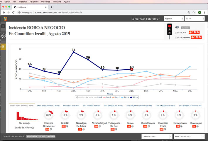 De acuerdo a los datos oficiales consultados, basados en denuncias ante el Ministerio Público, el robo a negocios en Cuautitlán Izcalli, en este 2019, de enero a agosto, ha sumado 362 casos; un promedio mensual de 45.25; 1.4 por día.