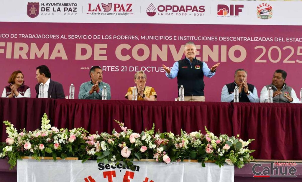 Asimismo, Cahue Calderón encabezó la firma del convenio con el Gobierno Municipal de La Paz, donde reconoció la voluntad de la presidenta municipal, Martha Guerrero González, para alcanzar incrementos salariales que van del 1 al 8 por ciento en beneficio de 293 trabajadores suteymistas que laboran en distintas áreas de la administración local.