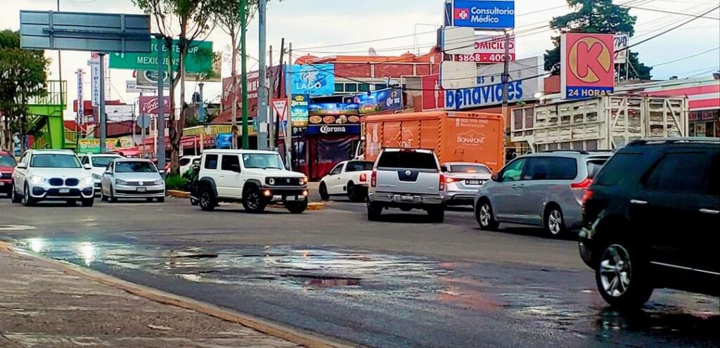 Infinidad de baches y áreas verdes sin mantenimiento, se padecen en Av. Lago de Guadalupe, en Atizapán; si transitan por la zona, tengan cuidado