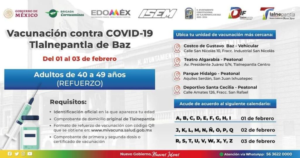 Naucalpan, Tlalnepantla y Atizapán aplicarán a partir de mañana la vacuna de refuerzo para personas de 40 a 49 años. admin hace 4 años En el caso del municipio de Naucalpan si habrá dosis para REZAGADOS. Checa aquí las sedes.