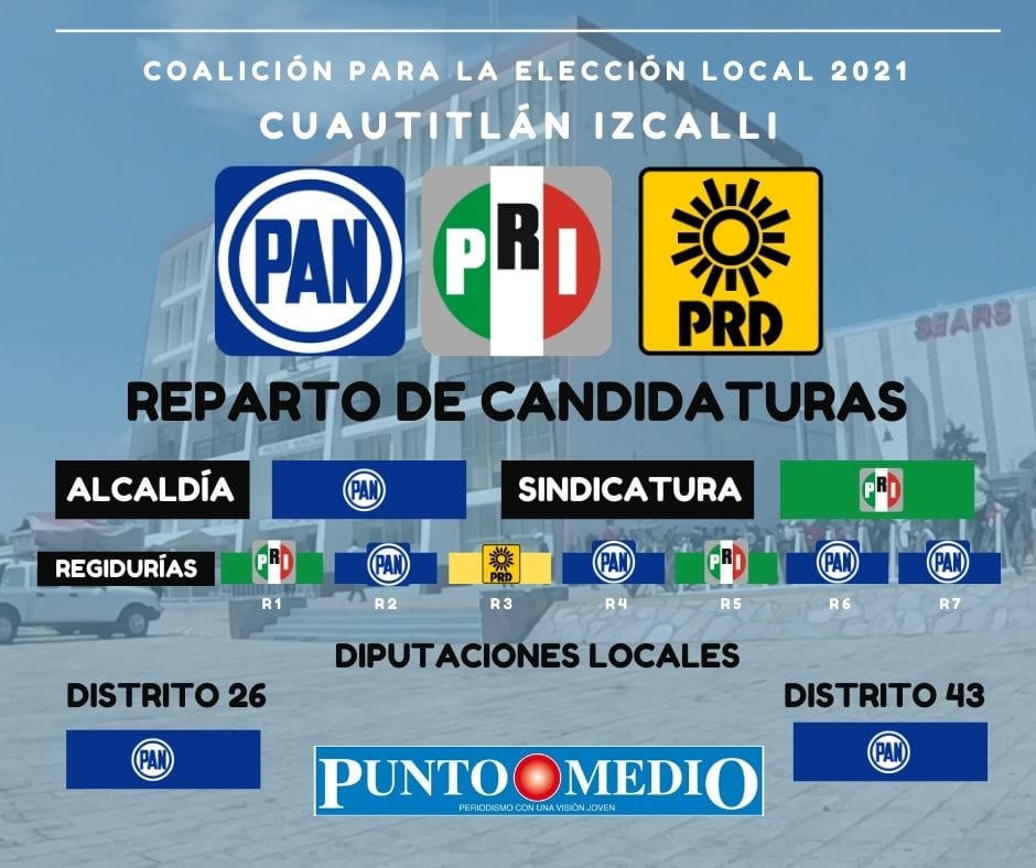 De acuerdo con el convenio de coalición entre el PRI-PAN-PRD para la elección de este año, en donde se van a renovar las 125 alcaldías y las 45 diputaciones locales, el Partido Acción Nacional fue el más beneficiado en el caso específico del municipio de Cuautitlán Izcalli, pues pondrá a los candidatos más importantes.