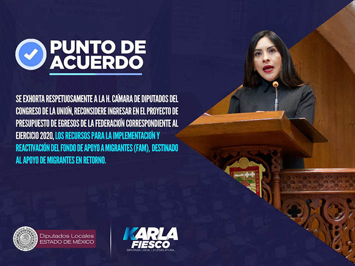 Con el fin de contar con recursos económicos para apoyar a connacionales que retornan de Estados Unidos, la diputada local del PAN, Karla Leticia Fiesco García, presentó ante el pleno de la Legislatura, un exhorto a la Cámara de Diputados del Congreso de la Unión, para que reconsidere integrar en el Proyecto de Presupuesto de Egresos de la Federación del 2020, los recursos para la implementación del Fondo de Apoyo a Migrantes (FAM). Su propuesta, fue aprobada por unanimidad.
