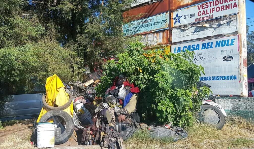 Esta persona en condición de calle, por momentos «camuflageado» entre la basura, está sobre una de las avenidas principales de Cuautitlán Izcalli, a unos metros del palacio municipal.