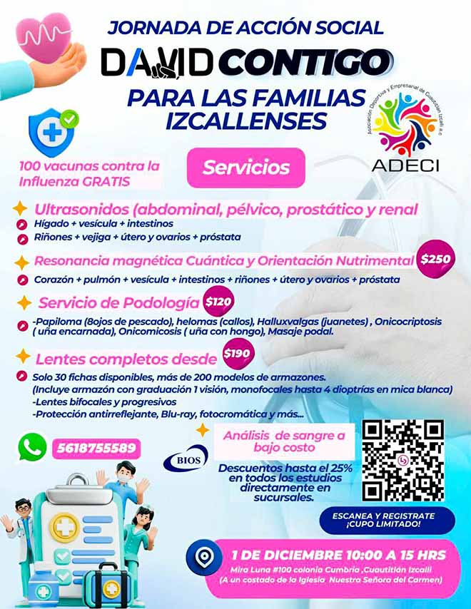 Con un llamado a la unidad y al trabajo comunitario, el líder de la Asociación de Empresarios y Deportistas de Cuautitlán Izcalli (ADECI), David Ramírez Zamudio, convocó a las y los habitantes del municipio a participar en una Jornada de Acción Social que se llevará a cabo el próximo 1 de diciembre en la colonia Cumbria, en la calle Mira Luna # 100, esquina con Mira Mar.