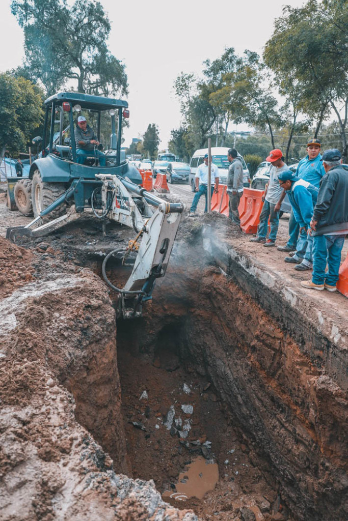 El desperfecto se presentó sobre los carriles laterales de la avenida Lomas Verdes, en su cruce con Bulevar Santa Cruz. La filtración se encontraba a seis metros de profundidad, en una línea de conducción de 8 pulgadas de diámetro.