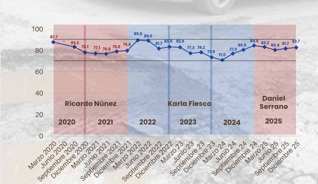 Durante la administración de Karla Fiesco García, por ejemplo, el indicador cayó de 89.5 por ciento en su arranque hasta 71 por ciento en el primer trimestre de su tercer año, el nivel más bajo registrado en toda la historia del municipio dentro de esta encuesta.