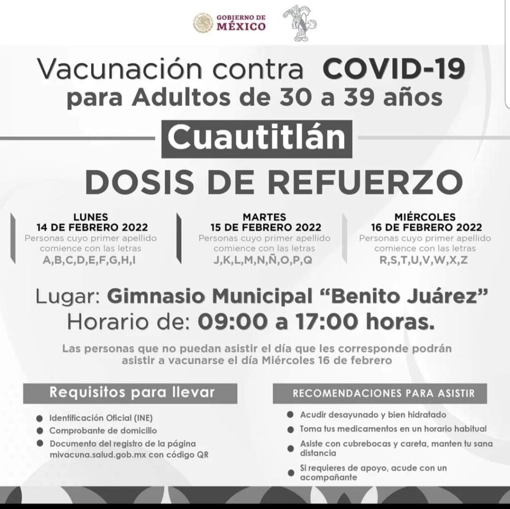 Vecinos de Cuautitlán recibirán refuerzo de la vacuna contra Covid19; es el turno del sector de 30 a 39 años.