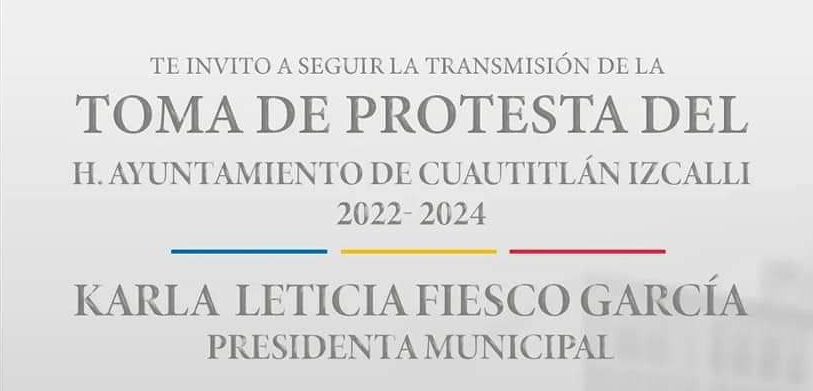 Mañana viernes 10 de diciembre se llevará a cabo la sesión solemne de Cabildo, en la que se rendirá la protesta de ley a Karla Fiesco García como nueva titular de la presidencia municipal de Cuautitlán Izcalli, así como a los integrantes del nuevo Ayuntamiento; la cita, es a las 10 de la mañana en la explanada principal del palacio de gobierno.